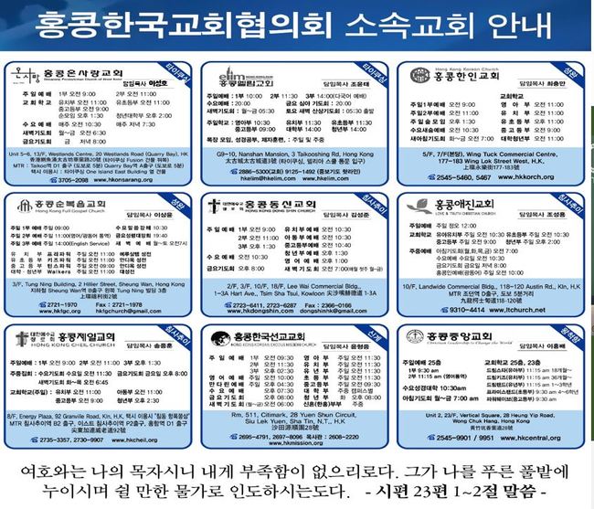 ▲▲홍콩한국교회협의회 소속교회 ※왕척항(홍콩중앙교회(2545 9901) ※성완(홍콩한인교회(2545-5460) / 홍콩순복음교회(2721 1970)※침사추이(홍콩동신교회(2723 6411/홍콩제일교회(2735 3357)/홍콩애진교회(9310 4414 ※타이쿠싱(온사랑교회(3705 2098)/ 홍콩엘림교회(2886 5300) ※신계사틴(홍콩한국선교교회(2695 4792)