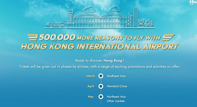 ▲ 무료항공권 50만장 배부(hkd약 1억) : 무료항공권은 홍콩 로컬항공사 캐세이퍼시픽, HK익스프레스, 홍콩항공에 배부한다. 무료증정은 3월 1일부터 약 6개월간 지속된다. 무료항공권을 배부받은 항공사는 다양한 프로모션 이벤트를 통해 여행자들에게 제공된다.