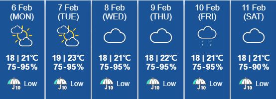 ■ 이번 주 날씨대체로 맑고 온화 동쪽에서 불어오는 바람으로 이번 주는 최저 18최고 21도로 맑고 온화할 것으로 예상된다아침에는 안개가 많겠으며 오는 수요일에는 강한 바람이 불 것으로 예상된다.
