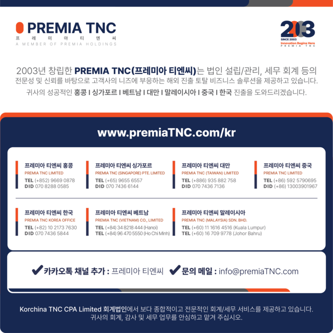 ■ 프레미아 티엔씨 (구 코차이나 티엔씨) : 법인 설립/관리, 회계 결산, 세무 자문 및 회계 감사 288 0585, info@premiatnc.com / 웹사이트 https://premiatnc.com/kr/