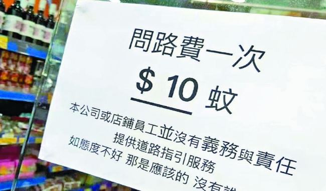 야마테이 지역 한 편의점에서 길을 물어보려면 hkd10을 지불해야한다는 안내문이 붙어있다. 해당 편의점은 이전에 버스회사의 매표소로 사용된곳으로 펜데믹으로 버스회사가 다른 곳으로 이전하고 편의점이 들어섰다.