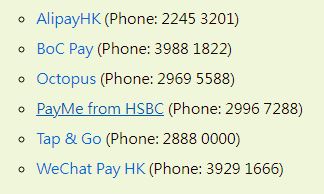 AlipayHK, BoC Pay, HSBC의 PayMe, Tap & Go, WeChat Pay HK 등록정보 수정