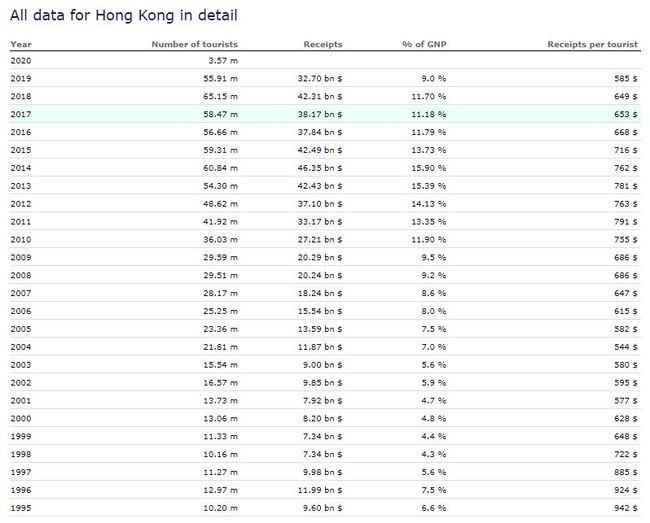한편, 홍콩인 경우, 연간 해외 방문객이 가장 많은 해는 2018년도로 약 6,500만명을 기록했다. 이후 2019년 사회불안으로 관광객이 감소하다가 코로나 발생 2020년부터 급감했다.