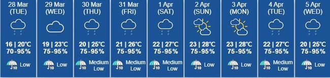 이번 주말부터 기온이 올라가 오는 4월 2일 일요일에는 28도까지 올라가겠으며 4월 5일 청명절 공휴일은 20-25도로 소나기가 내릴 것으로 예상된다.