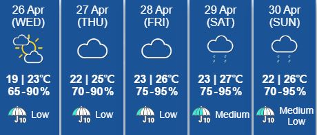 오늘아침 최저기온이 18도-19도를 기록했다. 향후 며칠 간은 북동풍의 영향으로 바람이 불고 선선할 것으로 예상된다. 주말에는 저기압이 광동해안에 형성되어 천둥번개를 동반한 소나기가 내리겠으며 다음 주 중반부터는 기온이 점차 오를 것으로 예상된다.