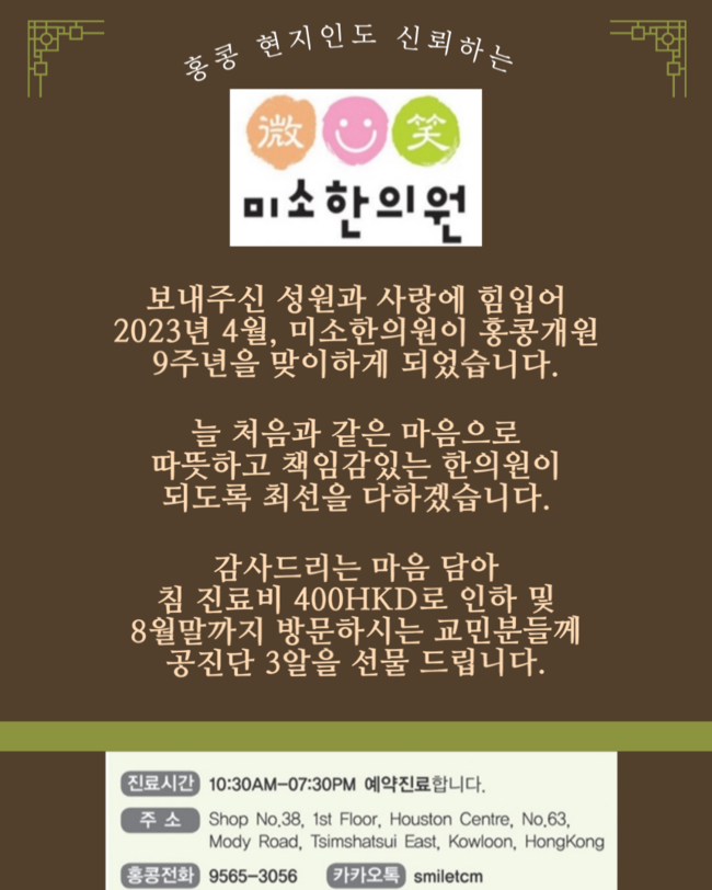 ■ 미소한의원 : 홍콩한타임즈 독자에게 20% 할인 : 고려대학교 심리학과 졸업, 홍콩, 중국 등록 중의학 전문의 / 몸과 마음 치유 문의환영 카카오톡 smiletcm / 문의 9565 3056