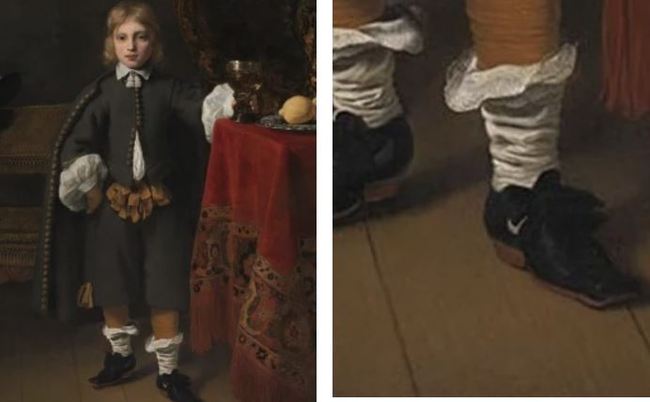 초상화는 검은 망토를 입은 8세 귀족 소년으로 1650년대에 그려졌다. 나이키는 1964년에 설립된 업체로 로고는 고대 그리스 신화의 승리의 여신의 날개를 표상화되어 고대 그리스 미술에서 자주 묘사된 것으로 알려졌다.