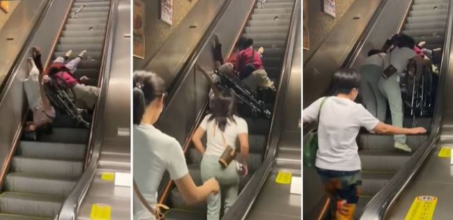 주위에 있던 사람들이 속히 에스컬레이터 버튼을 눌러 정지시켰다. 해당 동영상이 온라인에 게시되자 “휠체어는 엘리베이터를 이용해야한다.”고 지적했다.