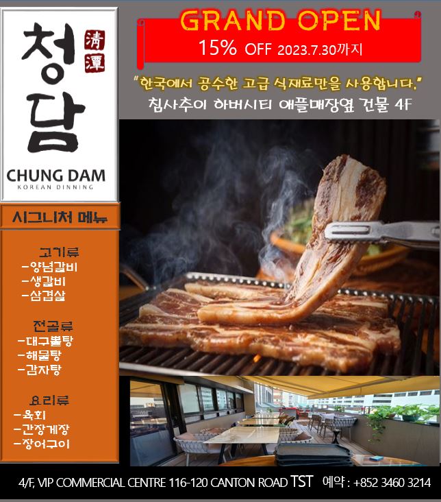 ■ 청담 한식당 : 오픈기념 15% 할인 (침사추이 하버시티 애플매장옆 건물 4층) 예약: 3460 3214 /고기류, 전골류, 한식 전체요리 7월 30일까지/ 중요한 고객과의 회식, 가족과의 행복한 식사, 디너 파티, 최고의 한식, 지금 예약하세요. 청담으로! 광동도 애플샆옆 건물 4층.