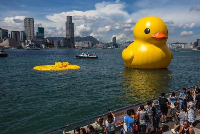 지난 금요일부터 빅토리아 해상에 대형 고무오리가 전시되었으나 어제 더위로 인해 한 마리가 팽창하기 시작했다. 팽창해진 오리는 공기를 빼내고 수리 후 다시 전시될 예정이다.