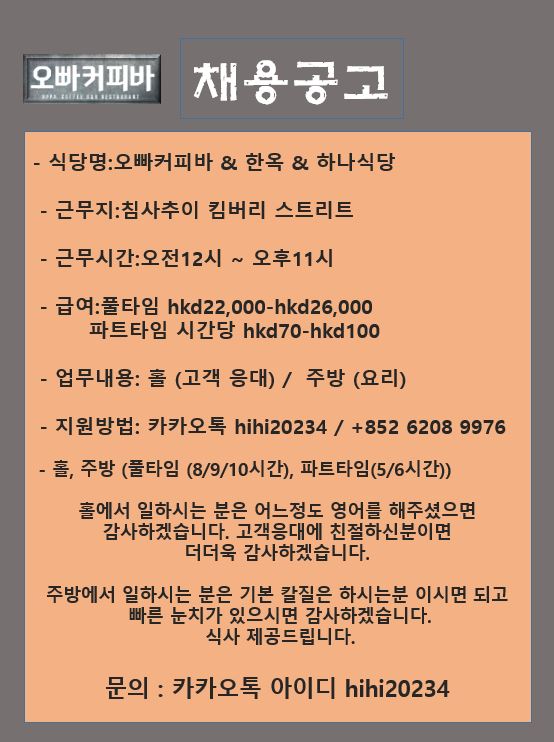 ■ 침사추이 한식당 직원채용 hkd22,000-hkd26,000 문의 6208 9976