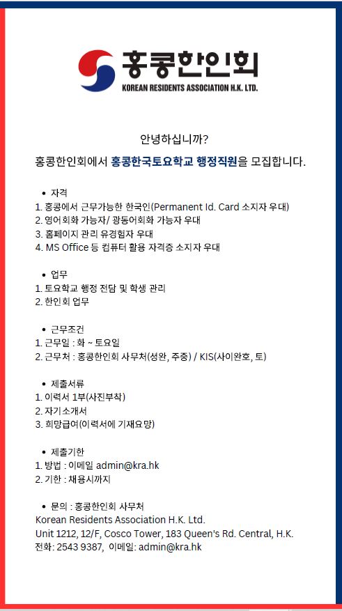 ■ 각종 보험, MPF 문의 : Korean Care Desk : tel. : 6279-0001) MPF 관련 & 각종보험 무료상담, 부담없이 문의하실 수 있습니다.
