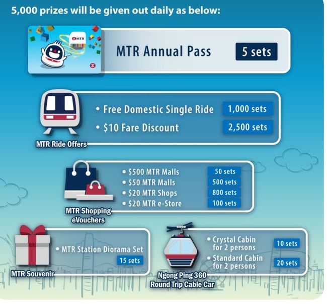 -상품 : 최대 hkd5,000 상당 경품, 옹핑 360 왕복티켓, MTR 연간 이용권 5명, MTR 무료 승차권, MTR hkd10 요금, 뷰티 및 패션구매쿠폰, 일본행 항공권(6월 21일 발표)