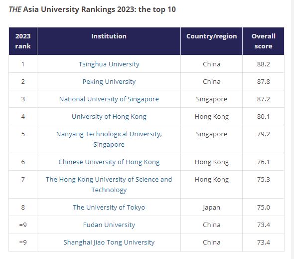 1위는 중국 칭화대학교, 2위 북경대학교, 3위 싱가포르 국립대학교, 4위 홍콩대학교, 5위 싱가포르 난양대학교, 6위 홍콩중문대학교, 7위 홍콩과기대 등이 상위에 올랐다.