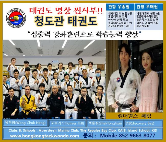 ▲ 청도관 : 태권도 명장 찐사부!!! 우종필 관장(세계태권도 연맹 9단), 우태권 관장(세계태권도 연맹 6단) 웡척항 제 4관 신규오픈, Fotress Hill, Shek Tong Tsui, D.B/ Clubs & Schools / 문의 : 852 9663 8077