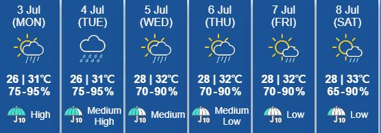 오늘과 내일 저기압이 광동해안에 넓게 형성되어 천둥을 동반한 소나기가 내리겠다. 이번 주 중후반에는 남서쪽에서 불어오는 바람의 영향으로 소나기가 몇 차례 더 내리고 더운 날씨가 이어지겠다.