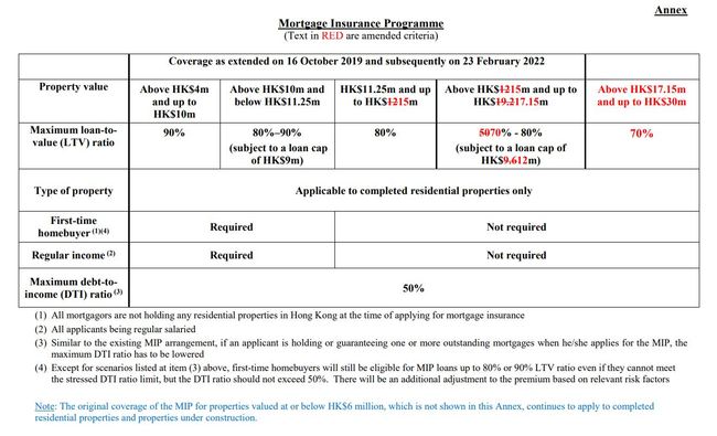 지난 2022년, 모기지를 90%까지 받을 수 있는 주택가격을 hkd1,000만으로 상승 조정했다.