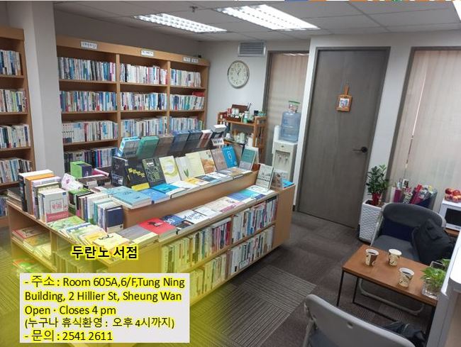 ■ “두란노 서점” 무료쉼터 제공 한국기독교 서적을 판매하는 두란노 서점이 홍콩섬 셩완MTR(출구B에서 1분거리에 있습니다. 약속장소로 두란노서점 이용환영입니다.(월~금) 커피와 차가 준비되어 있습니다.(무료제공) 많은 이용하시기 바랍니다.