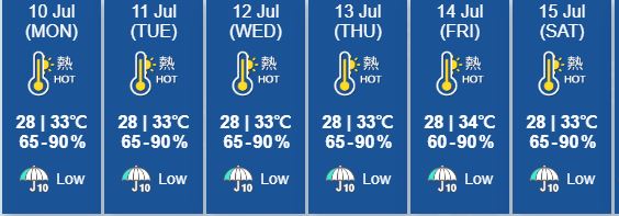 고기압 전선이 광동성 전역에 분포되어 이번 주도 매우 덥고 맑은 날씨가 이어지겠다. 천문대는 최고 기온 33도~34도까지 올라 갈 것으로 예측했다. 폭염경보 시에는 외부활동을 자제하고 수분섭취를 자주해주어 건강에 유의해야 한다.