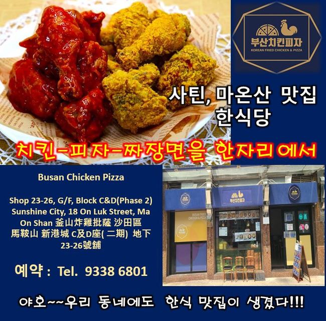 ▲ 마온산부산식당 : 치킨-피자-짜장면을 한자리에서 맛볼 수 있는 사틴지역 맛집 Shop 23-26, G/F, Block C&D(Phase 2) Sunshine City, 18 On Luk Street, Ma On Shan