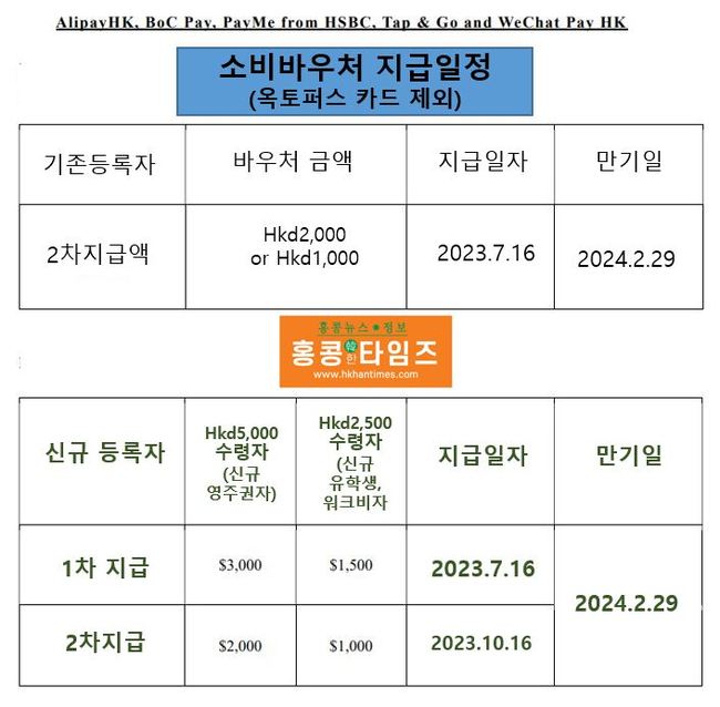 - 기존등록자(AlipayHK, BoC Pay, PayMe, Tap&o, WeChat Pay)는 영주권자에게는 hkd2,000, 비영주권자(워크비자, 유학생)은 hkd1,000이 지급된다.