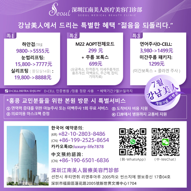 ▲ 콜라겐+ 피부과(홍콩 정식등록 피부 전문병원) : 각종 대회 심사위원 출신, 한국인 전문가