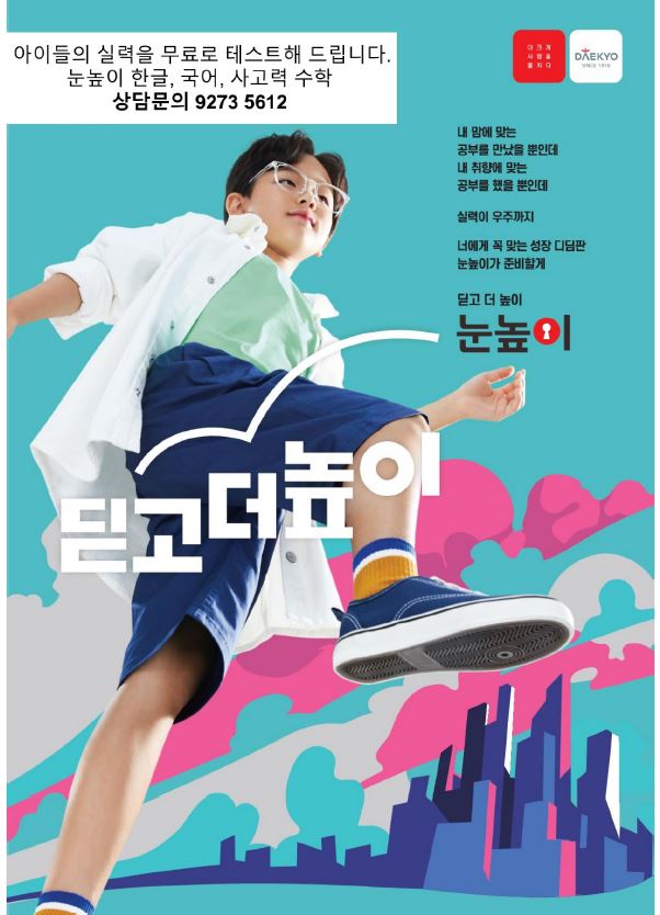 *대교 홍콩 눈높이 교육* : 눈높이와 함께 하면 공부가 즐겁다. 실력에 따라 단계별 맞춤학습---눈높이 한글, 눈높이국어,사고력 수학---상담및 문의 : 9273 5612 (Ms. Jenny)