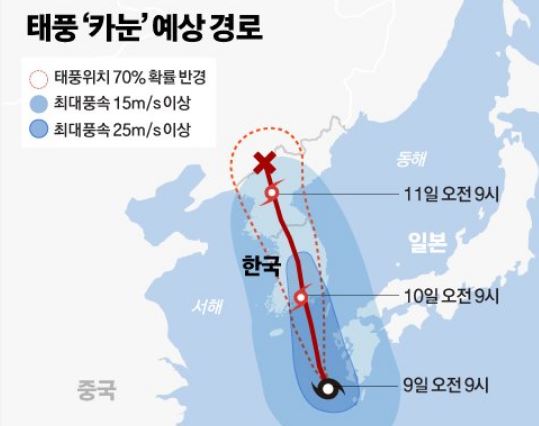 한국 공항, 약 80편의 항공편 운행이 중단되었다. 한국정부는 “어제부터 내일 11일까지 전국에 태풍경보를 최고단계로 격상했다.