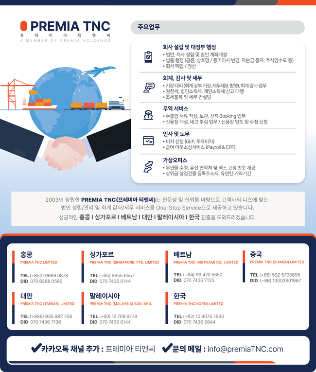 ■ 프레미아 티엔씨 (구 코차이나 티엔씨) : 법인 설립/관리, 회계 결산, 세무 자문 및 회계 감사 9669 0878, info@premiatnc.com / 웹사이트 https://premiatnc.com/kr