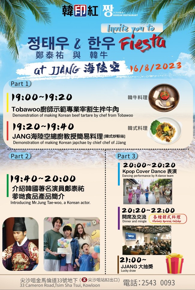 ■ 한인홍 침사추이 식당 “짱해육공”에서 오는 8월 16일 특별행사가 열립니다. 한국 탤런트 정태우, 유명세프가 함께하는 행사가 있습니다. 해당식당에서 식사 후 SNS에 후기를 한인홍 페북이나 인스타에 남기신 분들 중, 선착순 20분께 당일 행사에 초대드립니다.