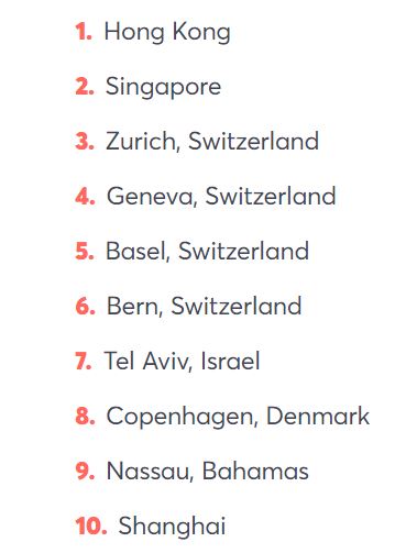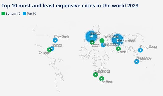 올해 2023년에는 해외근무자들이 살기에 가장 비싼 도시 10곳 중 2곳(홍콩, 싱가포르)만이 아시아에 위치한다.
