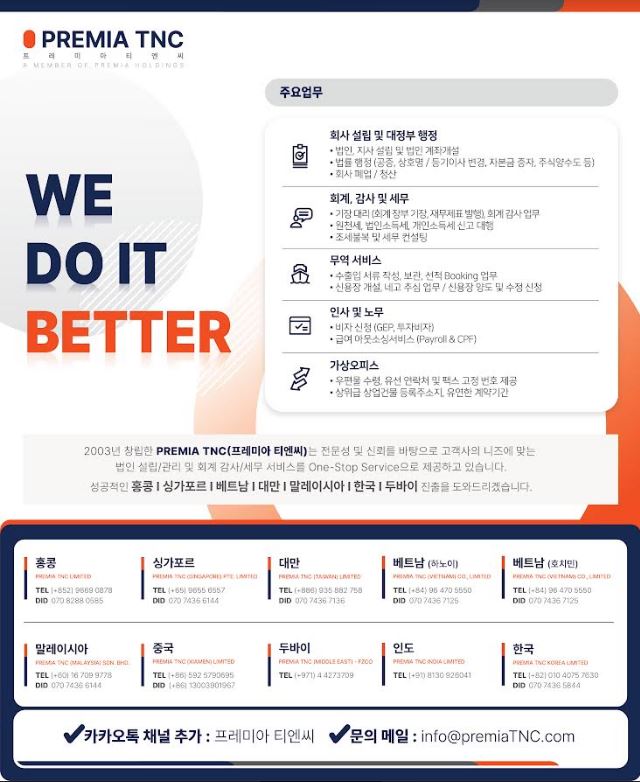 ■ 프레미아 티엔씨 (구 코차이나 티엔씨) : 법인 설립/관리, 회계 결산, 세무 자문 및 회계 감사 9669 0878, info@premiatnc.com / 웹사이트 https://premiatnc.com/kr//