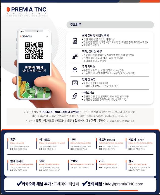 ■ 프레미아 티엔씨 (구 코차이나 티엔씨) : 법인 설립/관리, 회계 결산, 세무 자문 및 회계 감사 9669 0878, info@premiatnc.com / 웹사이트 https://premiatnc.com/kr//