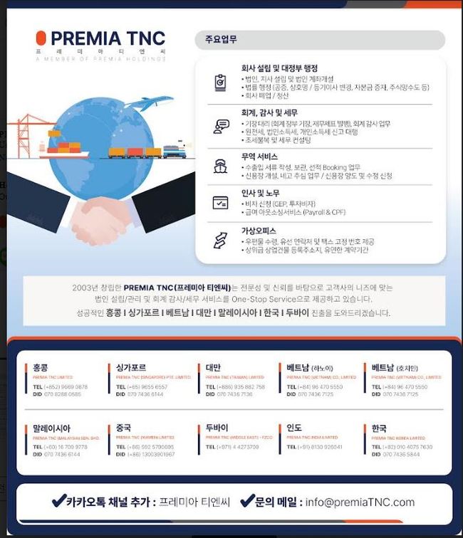 ■ 프레미아 티엔씨 (구 코차이나 티엔씨) : 법인 설립/관리회계 결산세무 자문 및 회계 감사 9669 0878, info@premiatnc.com / 웹사이트 https://premiatnc.com/kr//