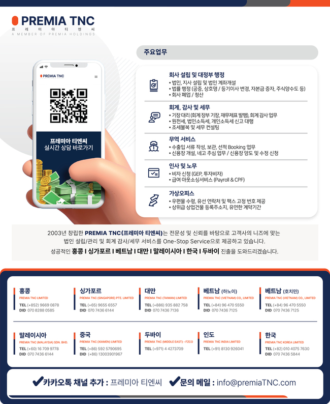 ■ 프레미아 티엔씨 (구 코차이나 티엔씨) : 법인 설립/관리, 회계 결산, 세무 자문 및 회계 감사 9669 0878, info@premiatnc.com / 웹사이트 https://premiatnc.com/kr//