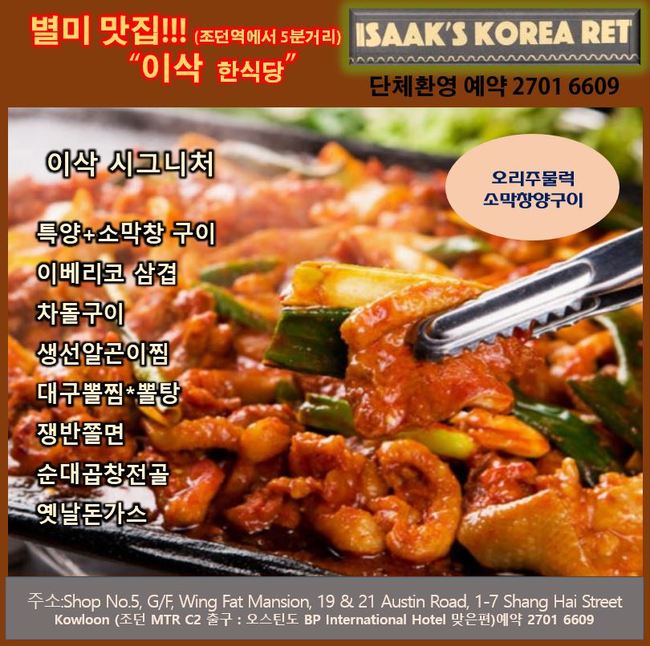 ▲ 이삭 한식당 : 착한 가격으로 모십니다. 대구뽈탕*뽈찜/옛날돈까스/특양+소막창구이/차돌구이/생선알곤이찜/쟁반쫄면/순대곱창전골/조단 MTR C2출구 예약 : 2701 6609