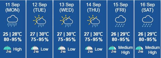 새 주간이 시작되는 오늘 월요일도 저기압의 영향으로 천둥번개를 동반한 소나기가 내리겠다. 내일 12일 부터 기압골이 다소 약해지다가 다시 후반부터는 중국 남부해안지역에 넓게 자리잡아 불안정한 날씨로 소나기가 내리겠다. 오늘 최고 기온은 28도이다.
