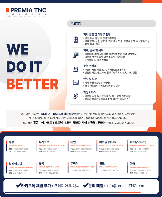 ■ 프레미아 티엔씨 (구 코차이나 티엔씨) : 법인 설립/관리, 회계 결산, 세무 자문 및 회계 감사 9669 0878, info@premiatnc.com / 웹사이트 https://premiatnc.com/kr//