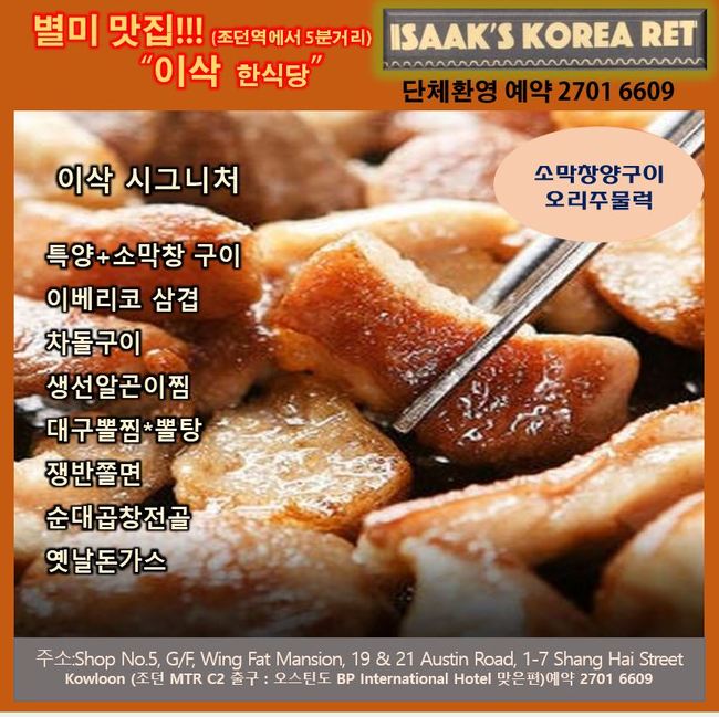 ▲ 이삭 한식당 착한 가격으로 모십니다대구뽈탕*뽈찜/옛날돈까스/특양+소막창구이/차돌구이/생선알곤이찜/쟁반쫄면/순대곱창전골/조단 MTR C2출구 예약 : 2701 6609