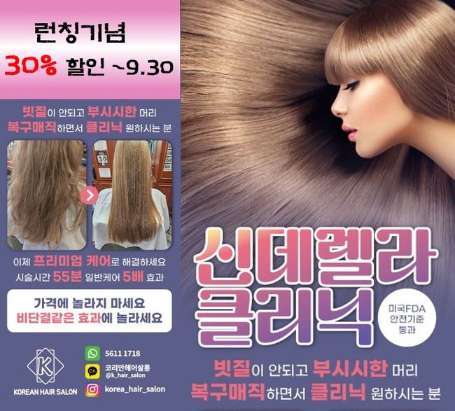 ▲ 한국헤어 아모레퍼시픽 프리미엄 헤어케어 브랜드아윤채 공식 파트너로서 프리미엄 약제만을 취급합니다한국인 헤어디자이너 9센트럴/코베/침추 3개 지점 운영커트(290불 부터), 염색트리트먼트닥터모락 두피 탈모 관리반영구, SMP 두피문신