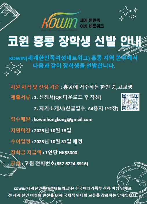 ■ 코윈홍콩, 장학생 선발 : 홍콩거주 한인 중,고교생 1인당 hkd3,000 지급