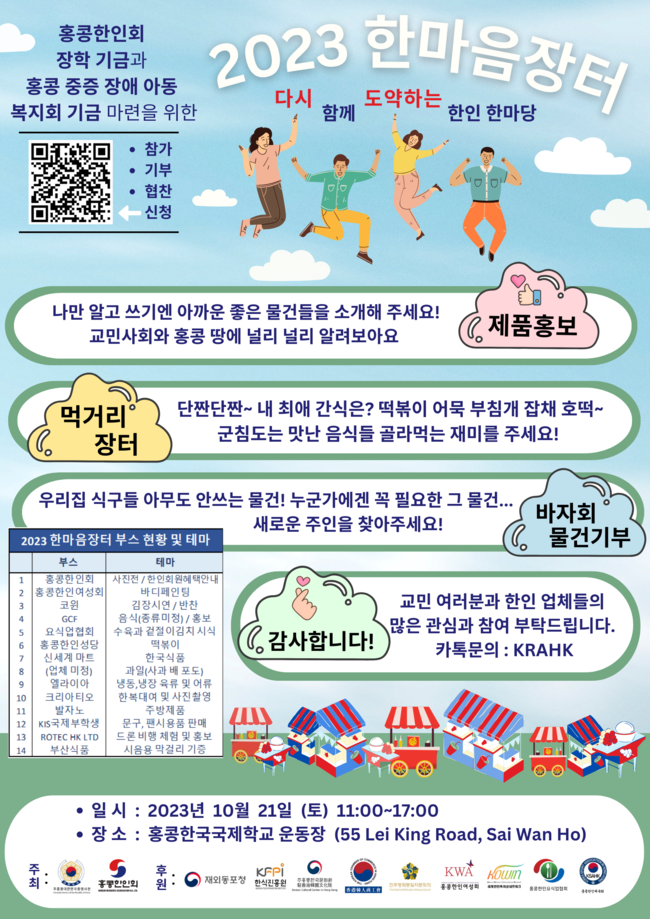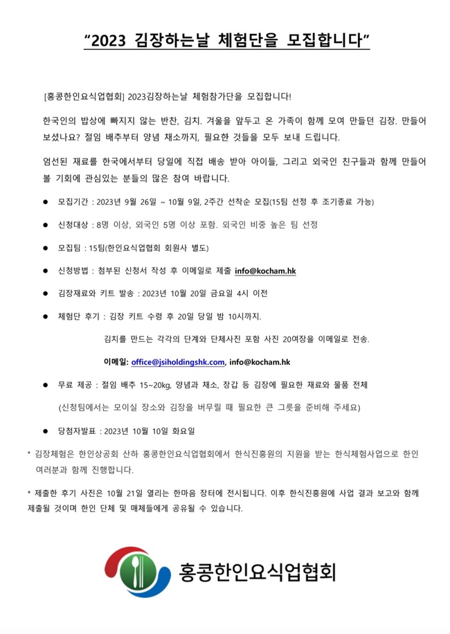 홍콩한인요식업협회(회장 이종석)에서 작년에 이어 2023김장하는 날 행사 참석신청을 받습니다. 신청양식을 작성하여 9일까지 접수된 신청 중 15팀을 선정하여 김장재료(절임배추, 김장양념, 김장채소, 비닐장갑 외 김장키트) 일체를 20일 오후 4시전까지 보내드립니다. 재료를 받으시고 바로 김장을 하신후 김장과정의 사진 20여장을 당일 밤까지 보내주시면 되겠습니다.