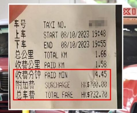 태풍 9호 경보중에 이용한 택시 이동시간이 약 7분으로 1.66km이지만 hkd732.7를 지불했다