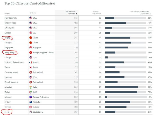 백만장자는 베이징 365명, 상하이 332명으로 각각 5위, 홍콩은 305명으로 8위를 기록했다. 중국과 홍콩을 합친 백만장자는 1,224명으로 전 세계 4.3%를 차지한다.