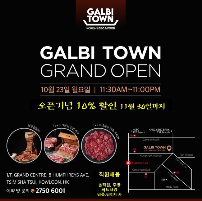 ■ 드디어 "갈비타운" 침사추이 오픈!! - 오픈기념 10% 할인 11월 30일까지~고기가 맛있는 진짜 갈빗집 갈비타운! 설탕 No. 물엿 No! 벚꽃꿀로 양념해 은은한 단맛의 벚꽃왕갈비와 1++ 8~9등급 신선한우가 준비되어있습니다. 쫀득하고 진한 맛의 한우 뭉티기도 놓치지마세요~! (예약문의) 2750 6001