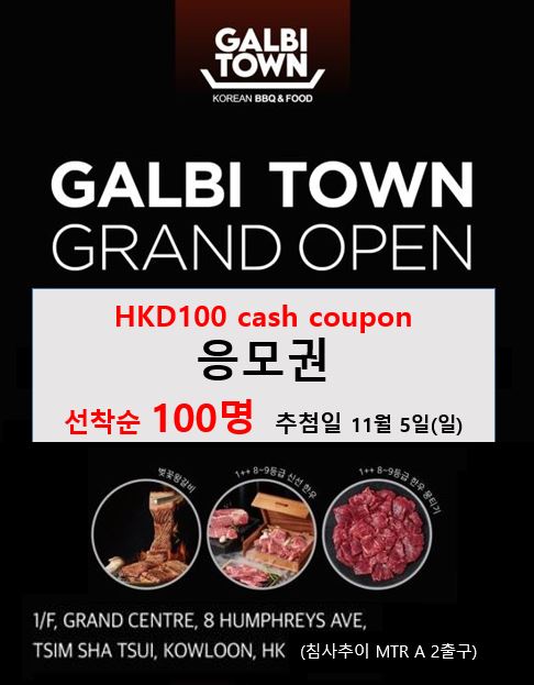 "갈비타운" 그랜드오픈 기념으로 홍콩한인 100분에게 hkd100 캐쉬쿠폰을 무료증정합니다. 카카오 채널 가입이 응모하는 것이며 '선착순 추첨'은 오는 금요일(3일)에 있습니다.