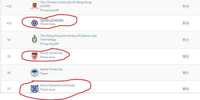 1위는 중국 북경대학교가 차지했고 홍콩대학교는 4위를 차지했다. 한국 KAIST는 8위에 올라 연세 12위, 고려15위, 서울대학교 17위 보다 상위를 차지했다.