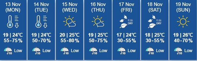 북동쪽에서 불어오는 차가운 바람으로 이번주는 아침과 밤에 기온이 내려간다. 오늘 최저기온은 19도로 쌀쌀하겠으며 오는 금요일에는 기온이 17도까지 더 떨어지고 건조하겠다.