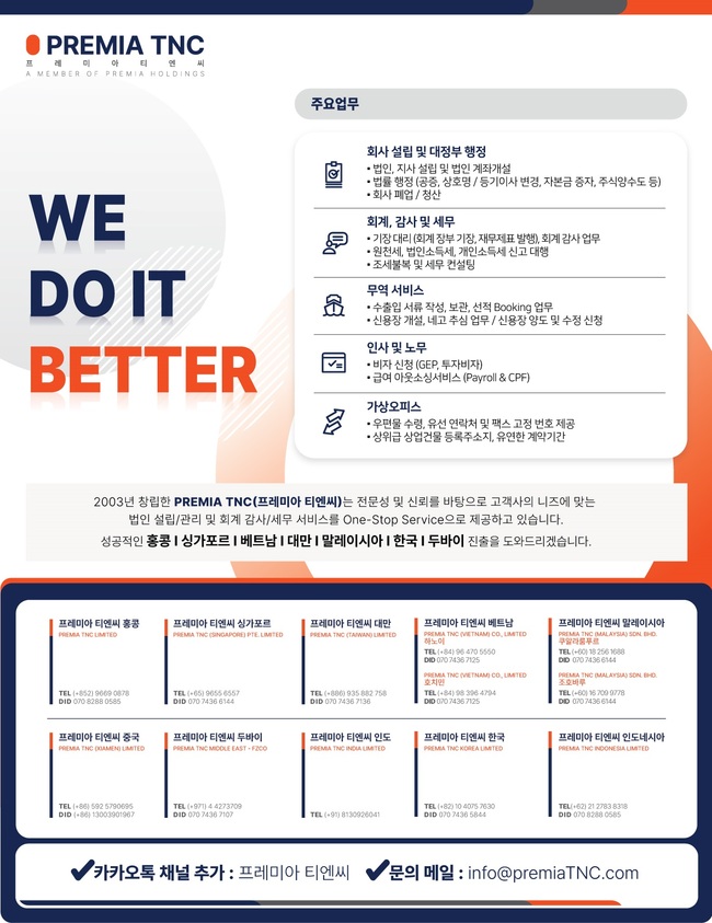 ■ 프레미아 티엔씨 (구 코차이나 티엔씨) : 법인 설립/관리, 회계 결산, 세무 자문 및 회계 감사 9669 0878, info@premiatnc.com / 웹사이트 https://premiatnc.com/kr//
