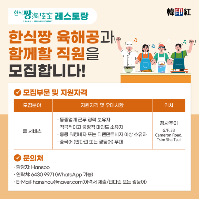 ■ 각종 보험, MPF 문의 : Korean Care Desk : tel. : 6279-0001) MPF 관련 & 각종보험 무료상담, 부담없이 문의하실 수 있습니다.  ■ 심천 강남미인 성형외과 개원 홍콩한인분들에게 드리는 주름보톡스 행사! 한 부위 무료시술/ 한국인 의사(상하이 복단대학교 의과대학교 졸업 / 북경대학교 의과대학교 졸업) 문의 : 카톡 luxury-life7878 /왓셉 86-199-2525-8654 ▲ 청도관 : 태권도 명장 찐사부!!! 우종필 관장(세계태권도 연맹 9단), 우태권 관장(세계태권도 연맹 6단) 웡척항 제 4관 신규오픈, Fotress Hill, Shek Tong Tsui, D.B/ Clubs & Schools / 문의 : 852 9663 8077 ▲신국화(NEW KWOK WHA MEAT) 한국농장 최초 직수입업체, 한우, 한돈, 삽겹살, 왕갈비 비, 국거리 ■ 청담 한식당 : 중요한 고객과의 회식, 가족과의 행복한 식사, 디너 파티, 최고의 한식, 식사후 분위기 바꿔서 야외테이블에서 시원한 생맥주 한잔~청담으로 오세요 예약 전화 : 3460 3214 (광동도 애플샆옆 건물 4층).4층  ▲▲홍콩한국교회협의회 교회 : ※왕척항(홍콩중앙교회(2545 9901) ※성완(홍콩한인교회(2545-5460) / 홍콩순복음교회(2721 1970)※침사추이(홍콩동신교회(2723 6411/홍콩제일교회(2735 3357)/홍콩애진교회(9310 4414 ※타이쿠싱(온사랑교회(3705 2098)/ 홍콩엘림교회(2886 5300) ※신계사틴(홍콩한국선교교회(2695 4791) ▲생생마트 : 한국식품 반찬가계 (김밥, 순두부, 간장게장 등)신계유엔롱 2819 3338  ▲ 솔무빙 : 포장이사, 특급택배 /홍콩국제물류 솔에어씨 /문의 5316-1715 www.solmarket.hk 한국식품 온라인 마켓 : ▲ ACI World Express / Door To Door 택배, 기업물류 서비스 문의 : 2759-7717 ▲ 화평건축 : 식당 및 면허취득, 아파트, 사무실, 샵, 교회, 독서실, 물류창고, 모든 실내장식 문의; : 6101-1785 Designer Esther ▲ 한국헤어 : 아모레퍼시픽 프리미엄 헤어케어 브랜드, 아윤채 공식 파트너로서 프리미엄 약제만을 취급합니다. 한국인 헤어디자이너 9명, 센트럴/코베/침추 3개 지점 운영, 커트(290불 부터), 염색, 펌, 트리트먼트, 닥터모락 두피 탈모 관리, 반영구, SMP 두피문신 ▲ 코아보석 : 다양한 디자인의 14k, 18k, diamond 제품 저가 판매 (예물, 선물용, 패션 제품, 금제품 고가매입 등) 영업시간 : 월-금 오전 10~오후 6시까지/매장주소 : Unit N(05), 3/F, Kaiser Estate Phase3, 11 Hok Yuen Str., Hung Hom. KLN 문의 852 2722 1795/Mobile phone 6622 9045 ■ 알에스 한국어 / 논술 / 입시 컨설팅 : 한국어와 논술, 그리고 한국 대학 입시를 고민할 때 가장 먼저 생각나는 곳, 교육 문의 : ☎ 9250 5687 ■ 각종 보험, MPF 문의 : Korean Care Desk : tel. : 6279-0001) MPF 관련 & 각종보험 무료상담, 부담없이 문의하실 수 있습니다. ■ 홍콩한타임즈 온라인 광고후원 문의 : 온라인 시대 귀사의 마케팅 부서 “홍콩한타임즈” 문의 : 9730-1755 / 카톡ID 242500ryune / 이메일 hkkrtimes@gmail.com |